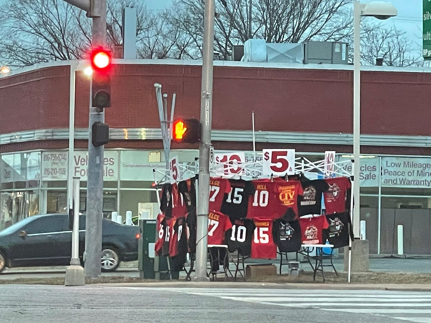 Oddly, one of my favorite parts of the Chiefs recent success in the playoffs is seeing people set up on the street corners with a little tent selling their unlicensed Super Bowl apparel. I’ve never seen anything like it growing up in a small town and even though I think it’s illegal(?), I respect the hustle.